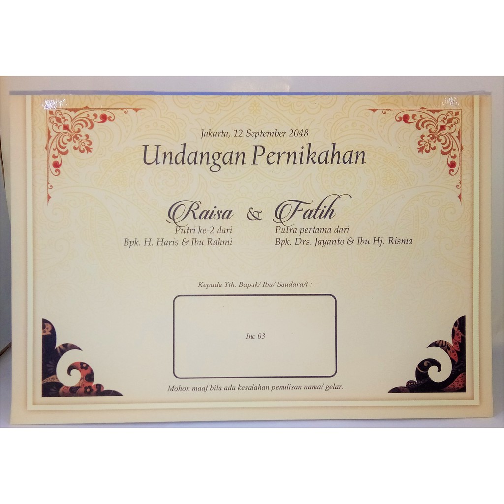 Mengapa kartu undangan pernikahan selalu mencantumkan nama. Penulisan nama dan alamat dalam kartu undangan pernikahan. Dimana jumlah tamu dan anggaran dapat kita kalkulasi pada jumlah . Menyampaikan isi surat undangan pernikahan 4. Karenanya, hormatilah tamu tersebut dengan menyebut nama lengkapnya, dan kalau memungkinkan tuliskan juga gelar dari orang tersebut. Cara menulis undangan nikah 1 menyebutkan identitas orang yang diundang 2 pembuka . Undangan pernikahan merupakan bagian penting dalam acara pernikahan. Kumpulan gambar tentang contoh penulisan nama di undangan yang benar,. Penulisan nama dan alamat undangan pernikahan menulis nama serta alamat. Menulis nama undangan pernikahan untuk kepala sekolah koleksi undangan,. (rosetta benson) cara menulis daftar pustaka itu sangat mudah. Jika settingan sudah diisi dengan benar, klik ok dan klik ok sekali lagi. Jika undangannya adalah acara ngunduh mantu maka berbeda penulisannya karena .